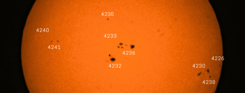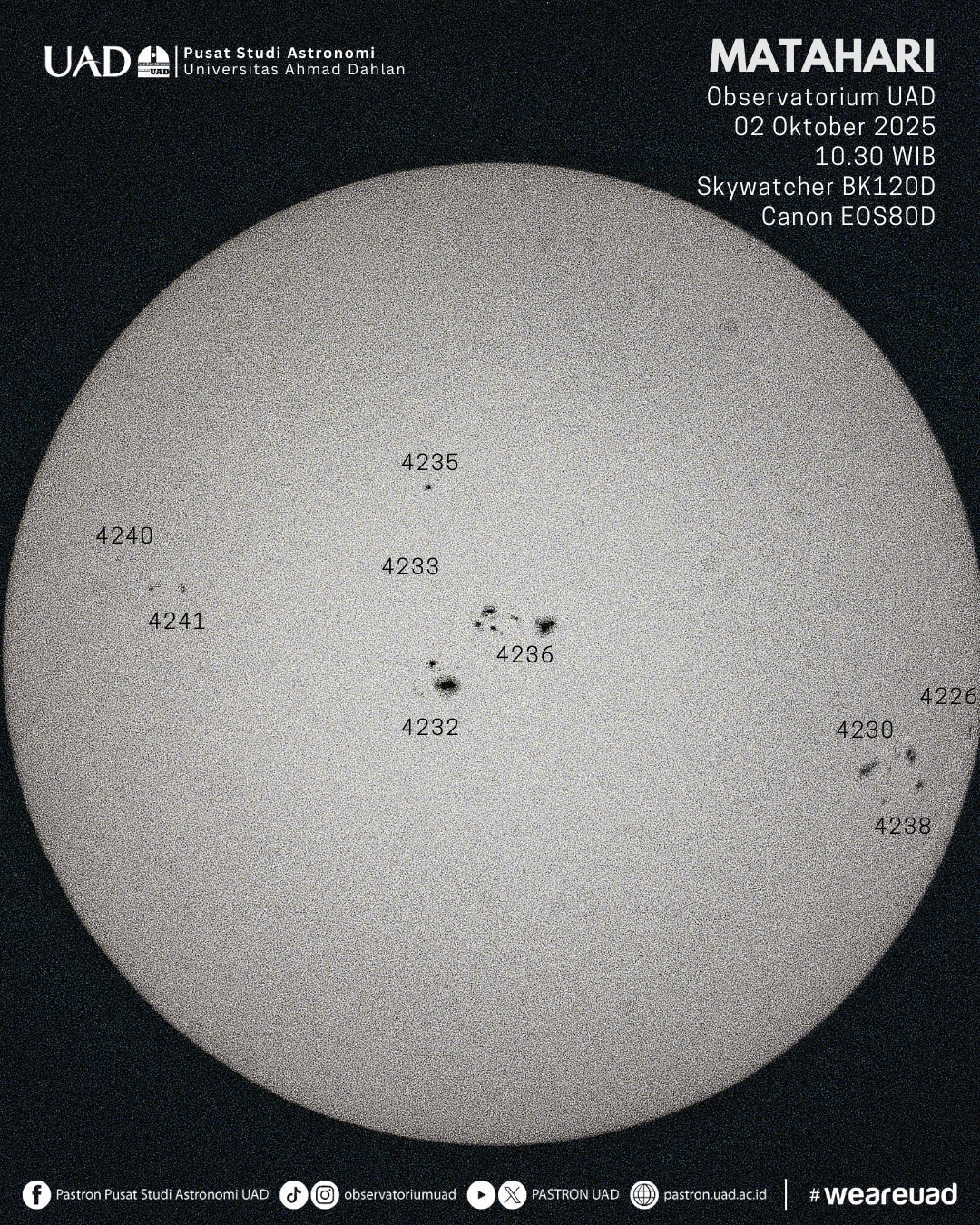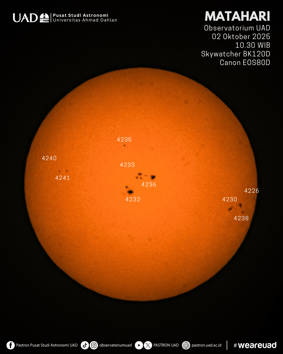 Pada 2 Oktober 2025, Tim Observatorium Universitas Ahmad Dahlan (UAD) berhasil mengabadikan citra Matahari pada pukul 10.30 WIB menggunakan teleskop Skywatcher BK120D dengan kamera Canon EOS80D. Hasil pengamatan menunjukkan banyaknya wilayah aktif (active region) dengan bintik Matahari (sunspot) berukuran besar dan kompleks di permukaan Matahari. Beberapa Active Region (AR) yang terdeteksi antara lain AR 4232, 4233, 4235, dan 4236 yang terletak di sekitar pusat piringan Matahari, serta AR 4226, 4230, dan 4238 di sisi timur. Sementara itu, AR 4240 dan 4241 tampak di sisi barat piringan Matahari.