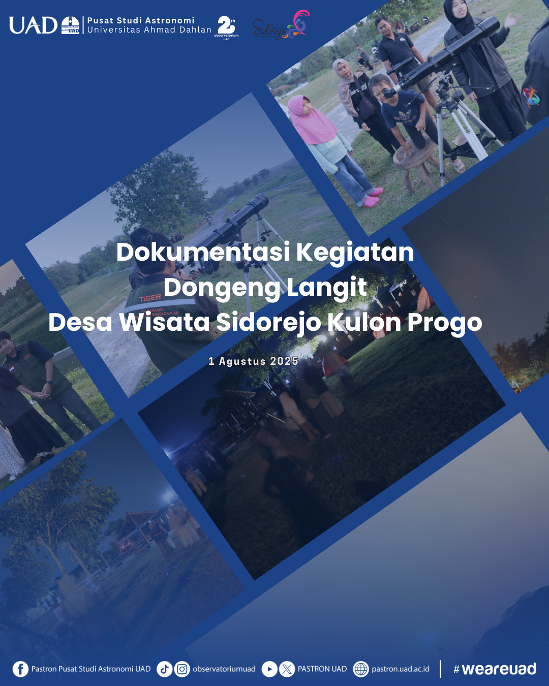 Jum’at, 1 Agustus 2025, Pusat Studi Astronomi Universitas Ahmad Dahlan (PASTRON UAD) bersama Desa Wisata Sidorejo mengadakan pengamatan langit malam (astrocamps) di Desa Sidorejo, Kapanewon Lendah, Kabupaten Kulon Progo, D.I. Yogyakarta. Acara ini bertujuan untuk memperkenalkan dan mengajarkan astronomi dalam konteks budaya Jawa, khususnya di Yogyakarta. kegiatan ini mencangkup beberapa sesi, yang pertama observasi matahari, sesi diskusi dan pembacaan wuku, dan observasi bulan dan planet.