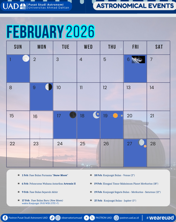 Tidak hanya fenomena langit, Februari 2026 juga menandai agenda penting dalam eksplorasi antariksa, yaitu rencana peluncuran wahana antariksa Artemis II pada 6 Februari. Misi ini merupakan bagian dari program eksplorasi Bulan yang bertujuan menguji kemampuan penerbangan berawak sebelum manusia kembali mendarat di Bulan. Dengan beragam peristiwa tersebut, Februari 2026 menjadi bulan yang kaya akan fenomena astronomi sekaligus momentum edukatif bagi masyarakat untuk mengenal lebih jauh tentang dinamika alam semesta.