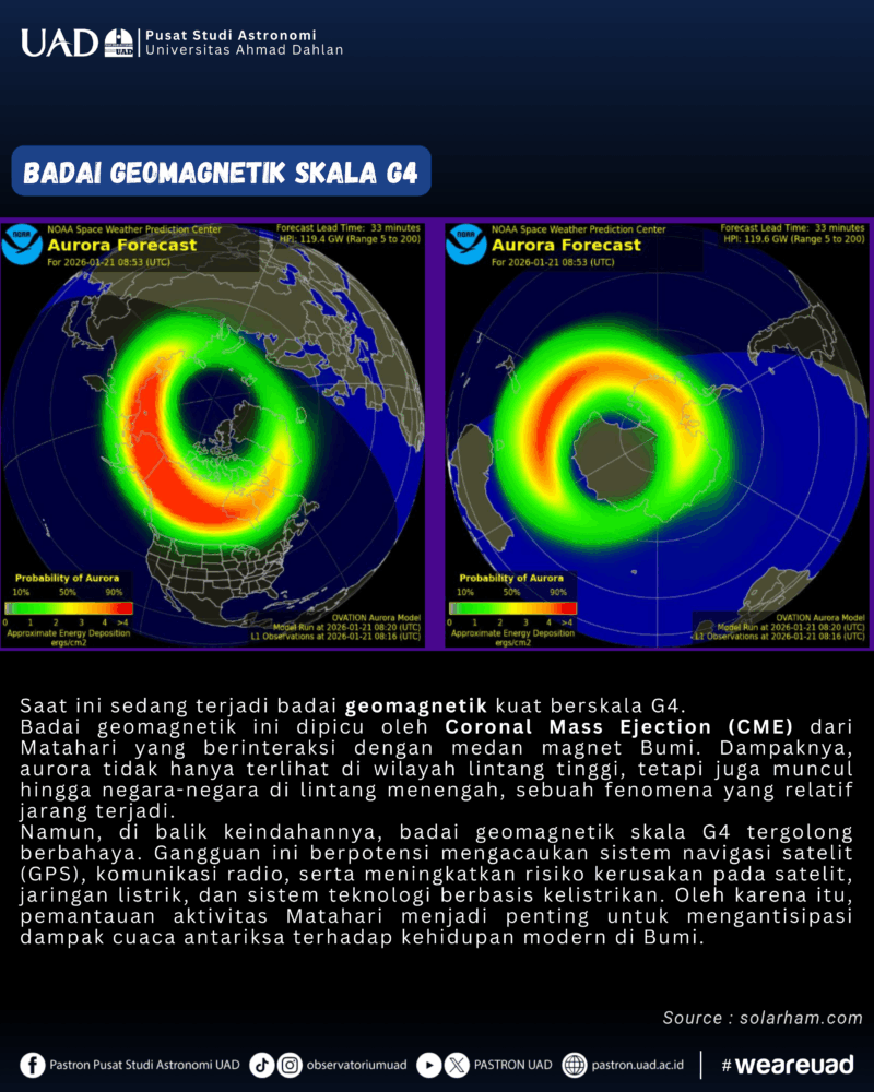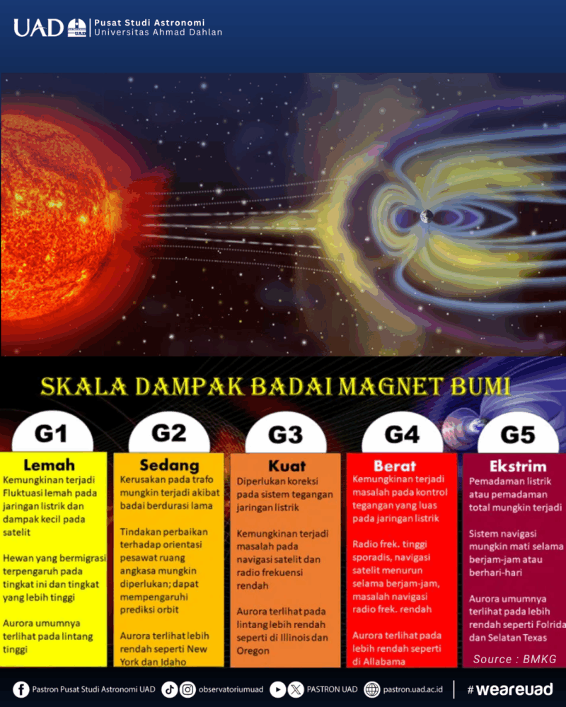 Badai geomagnetik dapat menimbulkan berbagai fenomena, mulai dari peningkatan intensitas aurora, gangguan pada sistem komunikasi radio, navigasi satelit, hingga fluktuasi pada jaringan listrik di wilayah tertentu. Meskipun Indonesia berada di lintang rendah dan relatif aman dari dampak langsung yang signifikan, fenomena ini tetap menjadi pengingat bahwa aktivitas Matahari memiliki pengaruh besar terhadap sistem Bumi.